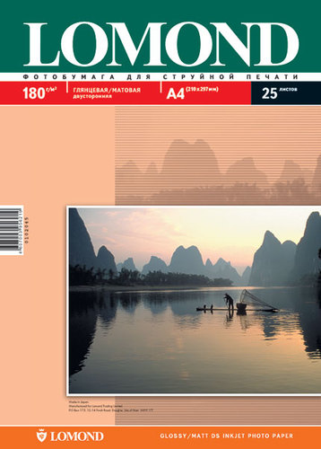 | Код | 0102045 |  | | Название | Двусторонняя Глянцевая/Матовая фотобумага для струйной печати, A4, 180 г/м2, 25 листов. |  | | Производитель | Lomond |  | | Серия | Photo Paper |  | | Область применения | Для струйных принтеров |  | | Тип носителя | Бумага |  | | Формат | A4 |  | | Ширина | 210 мм |  | | Длина | 297 мм |  | | Листов | 25 |  | | Основа | RC (Resin Coated) |  | | Тип покрытия | Ink Jet Coated |  | | Двусторонний носитель | Да |  | | Лицевая поверхность | Глянцевая (Glossy) |  | | Обратная поверхность | Матовая (Matt) |  | | Плотность | 180 г/м2 |  | | Краситель | Водорастворимые чернила |  | | Максимальное разрешение печати | 2880 dpi |  | | Цвет | Белый |  | | Дополнительная информация | Подробнее о структуре бумаг для струйной печати |  | | Код по складу | П000360 |  |