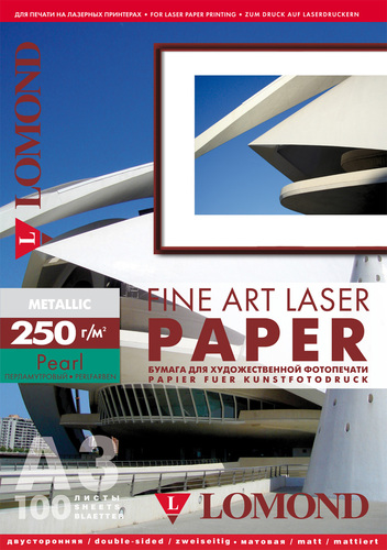 | Код | 0342435 |  | | Название | Fine Art Laser Paper Metallic Pearl, А3, 250г/м2, 100 листов |  | | Производитель | Lomond |  | | Область применения | Для лазерных принтеров |  | | Тип носителя | Бумага |  | | Формат | A3 |  | | Ширина | 297 мм |  | | Длина | 420 мм |  | | Листов | 100 |  | | Лицевая поверхность | Глянцевая (Glossy) |  | | Код по складу | П013249 |  |