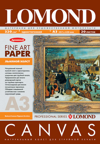 Плотный материал, имеющий натуральную льняную основу и одностороннее тонкое синтетическое покрытие для струйной печати, полностью сохраняющее фактуру ткани. Отпечатанные на этом холсте копии картин, выполненных в технике масляной живописи, демонстрировались на выставках. Даже эксперты не сразу могли отличить эти копии от экспонировавшихся рядом оригиналов.