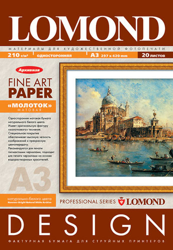 Односторонняя матовая бумага натурального белого цвета. Имеет оригинальную фактуру «молоткового» тиснения. Специальное покрытие обеспечивает высокую четкость изображений и прекрасную цветопередачу. Рекомендуется для печати любых фотографий, арт-постеров, открыток, дипломов, сертификатов, поздравительных адресов, портфолио. Обеспечивает особенно длительное хранение отпечатков. УСЛОВИЯ ИСПОЛЬЗОВАНИЯ И ХРАНЕНИЯ: Материал рекомендуется использовать и хранить при относительной влажности от 35 до 65% и температуре от 10 до 30 градусов Цельсия. Поверхность чувствительна к механическим повреждениям, поэтому рекомендуется хранить материал в оригинальных упаковках, конвертах или папках. При печати осторожно обращаться с материалом, не касаться запечатываемой поверхности. Для получения наилучших результатов рекомендуется использовать ICC-профили Lomond. По желанию пользователя отпечатанное изображение можно ламинировать. Ламинирование возможно любым способом. Рекомендуется производить не ранее, чем через 24 часа.