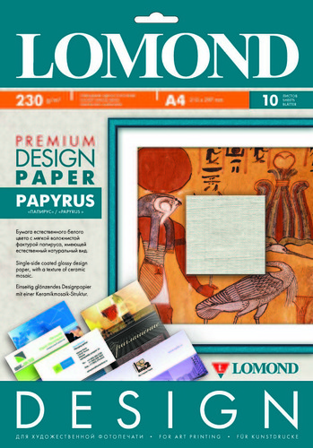 Фактура: Мягкая волокнистая фактура папируса, Матовая. Обратная сторона: Не используется. Формат A4 (210 x 297 см.), Плотость 230 г/м2. 10 листов. Для струйной печати. Водорастворимые и Пигментные чернила. Максимальное разрешение печати 2880 dpi.