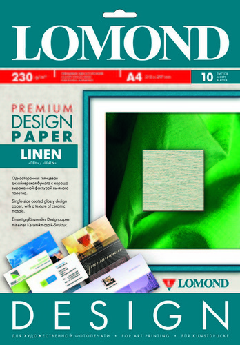 Фактура: Хорошо выраженная фактура льняного полотна, Глянцевая. Обратная сторона: Не используется. Формат A4 (210 x 297 см.), Плотость 230 г/м2. 10 листов. Для струйной печати. Водорастворимые и Пигментные чернила. Максимальное разрешение печати 2880 dpi.