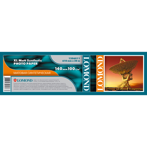 | Код | 1206011 |  | | Название | LOMOND XL Matt Synthetic Photo Paper - матовая синтетическая бумага, ролик 610мм*50,8мм, 100 г/м2, 30 метров |  | | Производитель | Lomond |  | | Область применения | Для струйных принтеров |  | | Тип носителя | Бумага |  | | Ширина | 610 мм |  | | Длина | 30 м |  | | Тип гильзы | Картонная |  | | Двусторонний носитель | Нет |  | | Лицевая поверхность | Матовая (Matt) |  | | Плотность | 100 г/м2 |  | | Толщина | 140 мкм |  | | Краситель | Водорастворимые чернила |  | | Код по складу | П006150 |  |