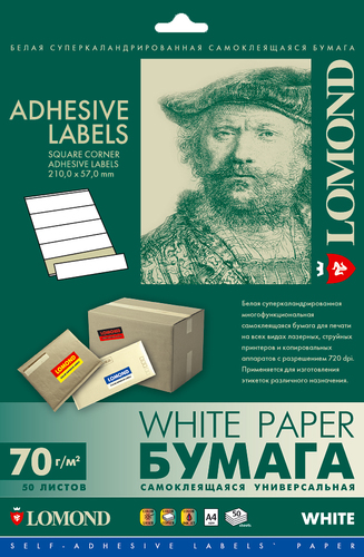Универсальная самоклеящаяся бумага Lomond предназначена для изготовления разнообразных лэйблов, этикеток и т.п., которые используются как наклейки на почтовую корреспонденцию, товарные упаковки и любые другие изделия.