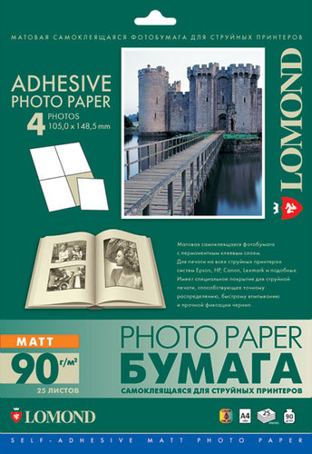 Cамоклеящаяся фотобумага Lomond имеет нерасплывающуюся, термоустойчивую клеевую основу, ровную поверхность, обеспечивает хорошее сцепление с неровными, неполяризованными поверхностями даже при низких температурах.