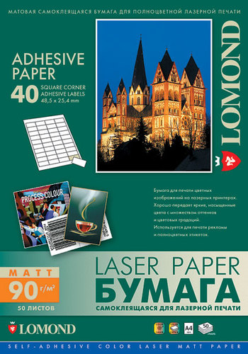 Матовая самоклеящаяся бумага Lomond предназначена для изготовления разнообразных лэйблов, этикеток и т.п., которые используются как наклейки на почтовую корреспонденцию, товарные упаковки и любые другие изделия. Бумага разработана для полноцветной печати на различных типах лазерных принтеров. Хорошо притягивает тонер, отличается идеальной проходимостью во всех типах принтеров. Матовая самоклеящаяся бумага Lomond имеет не расплывающуюся, термоустойчивую клеевую основу, ровную поверхность, обеспечивает хорошее сцепление с неровными, неполяризованными поверхностями даже при низких температурах.