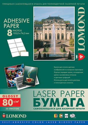 LOMOND Self-Adhesive Color Laser Glossy Paper Labels, A4, 8 частей (105,0x74,3 мм), 80 г/м2, 50 листов