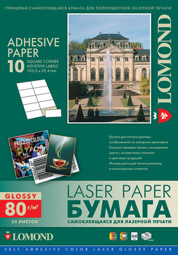 LOMOND Self-Adhesive Color Laser Glossy Paper Labels, A4, 10 частей (105,0x59,4 мм), 80 г/м2, 50 листов