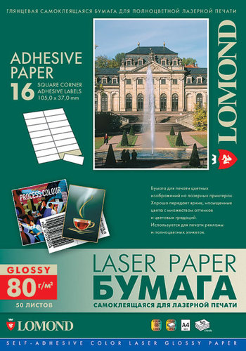 LOMOND Self-Adhesive Color Laser Glossy Paper Labels, A4, 16 частей (105,0x37,0 мм), 80 г/м2, 50 листов