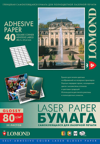 Глянцевая самоклеящаяся бумага Lomond предназначена для изготовления разнообразных лэйблов, этикеток и т.п., которые используются как наклейки на почтовую корреспонденцию, товарные упаковки и любые другие изделия. Бумага разработана для полноцветной печати на различных типах лазерных принтеров. Хорошо притягивает тонер, отличается идеальной проходимостью во всех типах принтеров. Глянцевая самоклеящаяся бумага Lomond имеет не расплывающуюся, термоустойчивую клеевую основу, ровную поверхность, обеспечивает хорошее сцепление с неровными, неполяризованными поверхностями даже при низких температурах.