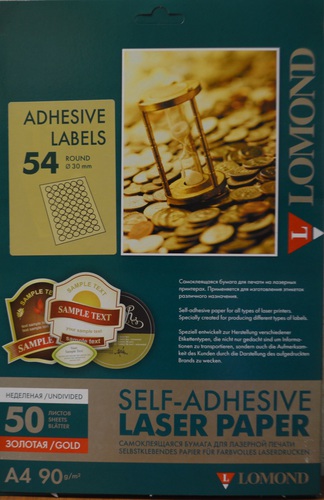Самоклеющаяся наделенная бумага Lomond Self-Adhesive Gold Laser Paper, 54 круглых этикетки диаметром 30 мм каждая на листе А4 формата, плотность бумаги 80 г/м2, 50 листов в пачке. Полуматовая самоклеющаяся бумага цвета «Золото фольга».