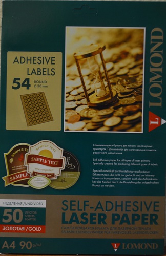 Самоклеющаяся наделенная бумага Lomond Self-Adhesive Gold Laser Paper, 54 круглых этикетки диаметром 30 мм каждая на листе А4 формата, плотность бумаги 80 г/м2, 50 листов в пачке. Полуматовая самоклеющаяся бумага цвета «Старое золото»